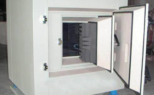 由于消声箱隔音指标要求高,消声箱设计为三层隔振结构型式、内外两扇隔音门,隔音箱外壳(内壳同样)用 2-3mm厚优质冷轧电解钢板与多层阻尼隔音材料复合而成,外表采用静电喷涂,三层壳体间填有隔音板、阻尼板、环保吸音棉等材料,内层有吸音模块材料等,隔音箱门边有密封胶垫,箱内配有产品测试电缆接口等。